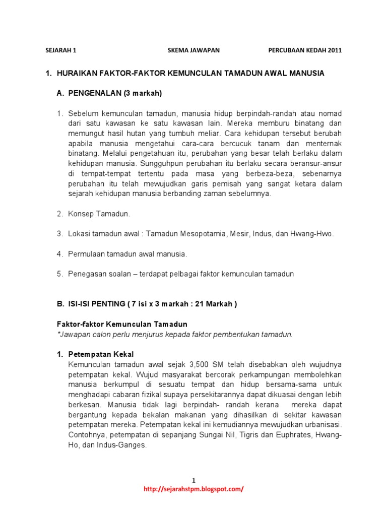 1 Huraikan Faktor Faktor Kemunculan Tamadun Awal Manusia A Pengenalan 3 Markah