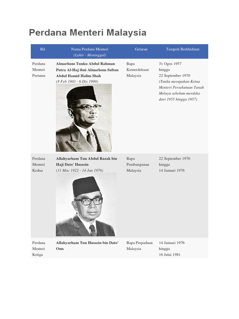Senarai Perdana Menteri Malaysia Pertama Hingga Ke Tujuh