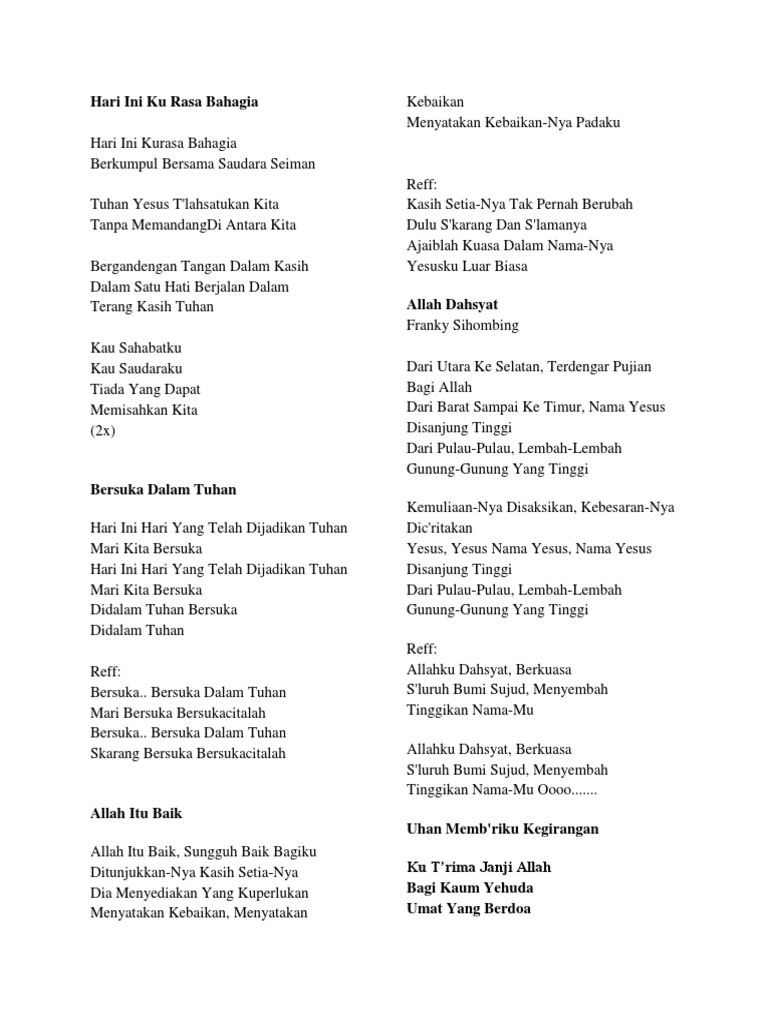 Bergandengan tangan dalam kasih dalam satu hati berjalan dalam terang kasih tuhan kau saudaraku kau sahabatku tiada yang dapat memisahkan kita kau saudaraku kau sahabatku tiada yang dapat memisahkan kita. Hari ini kurasa bahagia berkumpul bersama saudara seiman tuhan yesus t lah satukan kita tanpa memandang di antara kita chorus. Lirik lagu hari hari ku lalui lirik lagu hari ini ku rasa bahagia lirik lagu hari ini harinya tuhan lirik lagu hanya yesus jawaban hidupku lirik lagu hari lepas hari lirik lagu nanya nama yesus lirik lagu hanya kau lirik lagu hanya dia lirik lagu hanya dekat kasihmu lirik lagu hanya dekat allah saja.