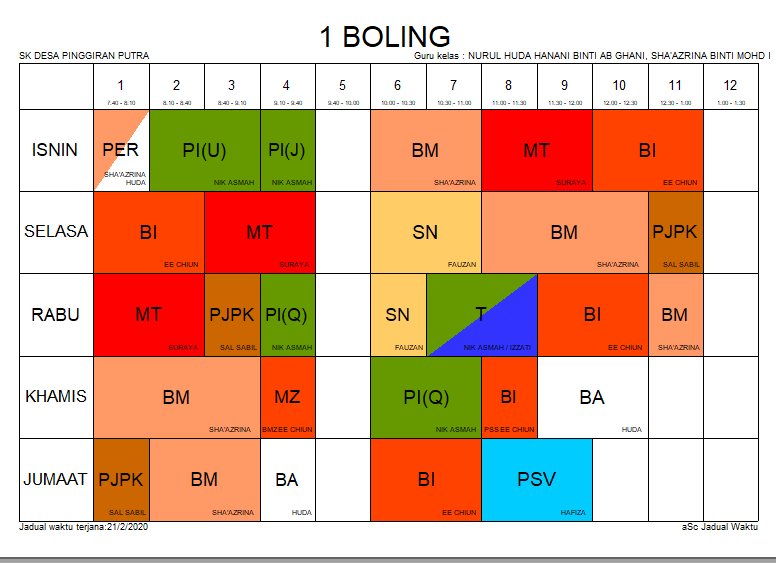 Jadual Waktu Pembelajaran Mengikut Kelas Januari 2020 Bermula 1 Januari 2020 Sekolah Kebangsaan Taman Bukit Indah